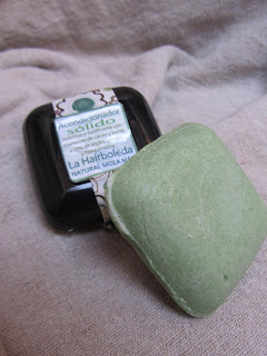 Le preparo a mi amigo Carlos, que es casi mi hermano, su acondicionador boscoso porque tiene una laaarga melena que pide acondicionado,y como ahora sé que anda viajero y que le va a venir mejor cargar con algo pequeñito en vez de con el megafrasco habitual, y que, de decidir no andar de botella arriba-botella abajo su melena se va a resentir, le he hecho una version del mismo en pastilla.